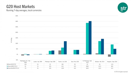 近日G20峰會在德國漢堡舉辦,截至7月8日,STR分析了前八個主要酒店市場的七天平均值。為了反映漢堡的潛在結(jié)果,分析排除了三個市場(法國戛納,墨西哥Los Cabos和土耳其Serik),以維持大型酒店市場的基準(zhǔn)重點(diǎn)。七天滾動平均法計算了5天內(nèi)每個事件所產(chǎn)生的酒店業(yè)務(wù)以及為期兩天的活動本身。