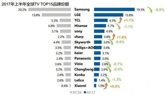 從這個圖表可以看出,2017年上半年全球TOP15的彩電品牌中,互聯(lián)網(wǎng)品牌僅有樂視和小米,傳統(tǒng)電視品牌依然占據(jù)了絕對的主力。上半年樂視銷量總占比下滑1.3%,但這部分下滑的銷量顯然并沒有全部被小米奪取,因為小米在總電視市場的銷量增幅僅為0.4%。