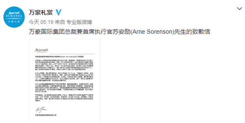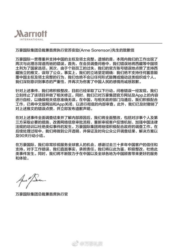 1月12日凌晨,萬豪國際集團(tuán)微博賬號(hào)“萬豪禮賞”發(fā)布該集團(tuán)總裁兼CEO蘇安勵(lì)的致歉信。致歉信中稱,“由于個(gè)別員工的過失,我們的官方賬號(hào)錯(cuò)誤地點(diǎn)贊了支持‘西藏獨(dú)立’的推文,誤導(dǎo)了公眾?!?/p>