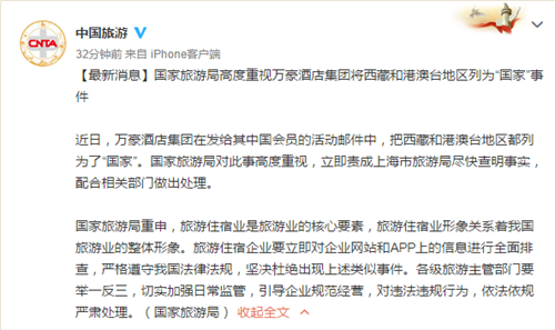 近日,萬豪國際集團(tuán)在發(fā)給其中國會(huì)員的活動(dòng)郵件中,把西藏和港澳臺(tái)地區(qū)都列為了“國家”。國家旅游局對此事高度重視,立即責(zé)成上海市旅游局盡快查明事實(shí),配合相關(guān)部門做出處理。