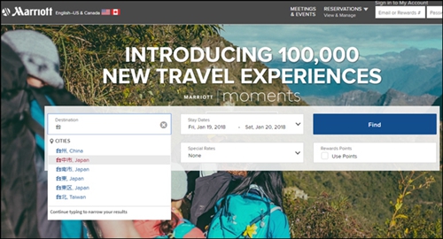 新聞來源:宏輝智通 發布日期:2018-01-20 瀏覽次數:3040在萬豪英文版網站頁面輸入“臺”字,下拉菜單中出現中國臺灣的“臺中市”、“臺南市”和“臺東(縣)”,竟然都被標明所屬于日本。