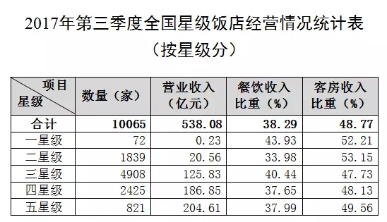 全國10065家星級飯店第三季度的營業收入合計538.08億元,其中餐飲收入為206.03億元,占營業收入的38.29%;客房收入為262.42億元,占營業收入的48.77%。