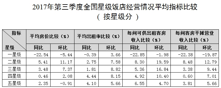 全國星級飯店第三季度平均房價為340.25元/間夜,平均出租率為60.58%,每間可供出租客房收入為206.12元/間夜,每間客房平攤營業收入為35387.99元/間。