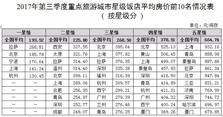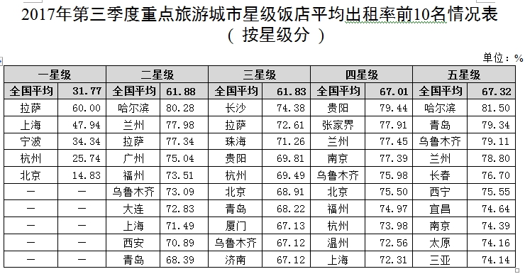 從第三季度各地區經營情況看,平均房價高于全國平均水平340.25元/間夜的有8個省份,位居全國前6位的為上海、北京、海南、西藏、天津和廣東,其中上海最高為688.83元/間夜;平均出租率高于全國平均水平60.58%的有13個省份,位居前6位的為北京、上海、西藏、兵團、貴州和湖南,其中北京最高為72.37%;每間可供出租客房收入高于全國平均水平206.12元/間夜的有9個省份,位居前6位的為上海、北京、西藏、海南、天津和福建,其中上海最高為492.06元/間夜;每間客房平攤營業收入高于全國平均水平35387.99元/間的有8個省份,位居前6位的為上海、北京、江蘇、浙江、廣東和天津,其中上海最高為84308.67元/間。