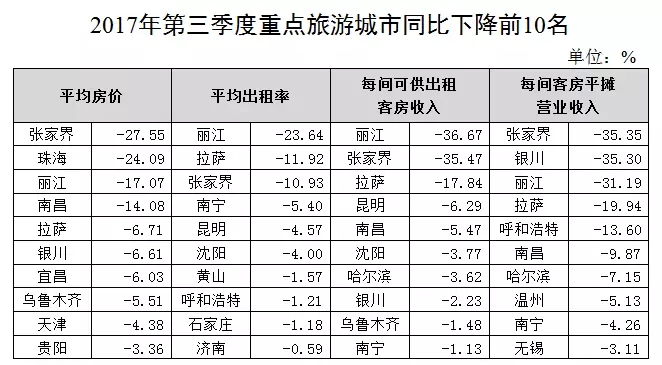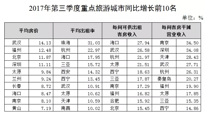 每間可供出租客房收入:增幅位居前10位的城市為海口、武漢、杭州、太原、西寧、三亞、南京、福州、合肥、北京,其中海口增幅最大,為27.94%;降幅位居前10位的城市為麗江、張家界、拉薩、昆明、南昌、沈陽、哈爾濱、銀川、烏魯木齊、南寧,其中麗江降幅最大,為36.67%。