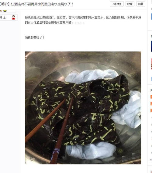 這兩天,一則微博網帖在網上頗受網友關注:“昨天聽同事說,他在一個群看別人聊天,一個女的說她特別愛干凈,每天晚上都要燒開水燙馬桶、煮內褲。……對!你們沒有看錯,是煮內褲!還說她每次出差或旅行,住酒店,都不用房間里的電水壺燒水,因為據她所知,很多愛干凈的女士住酒店時都會用電水壺煮內褲!