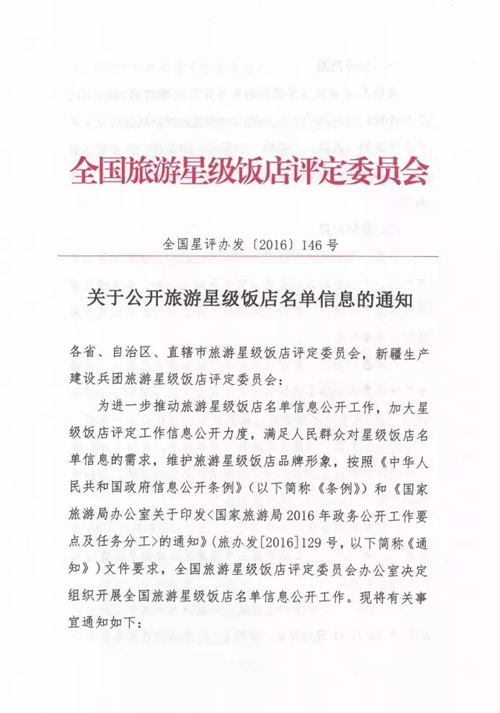 日前,全國星評辦下發(fā)《關于公開旅游星級飯店名單信息的通知》,組織各省、自治區(qū)、直轄市旅游星級飯店評定委員會,新疆生產建設兵團旅游星級飯店評定委員會開展全國旅游星級飯店名單信息公開工作。這意味著某飯店幾星級、所在地區(qū)、星級標牌編號今后都將“上網可查”。