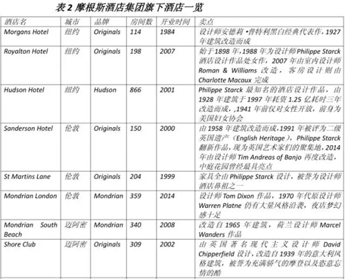 自從1984年推出第一家精品酒店摩根斯酒店以來,摩根斯酒店集團如今已發展成為持有、收購、經營精品酒店的綜合業務酒店管理集團,目前持有、管理近5000間精品客房。作為精品酒店的鼻祖,摩根酒店集團目前自詡“精致生活品味酒店(Boutique Lifestyle Hotel)”的創始者和引領者。旗下各品牌都擁有個性鮮明與風格突出的設計,是創造風格趨勢的先鋒代表,潮流時尚的匯集地,致力于為品味不凡的世界旅者與創意人士提供世界各大都會中位于最繁華地段的最私密住所與隱蔽休憩空間。