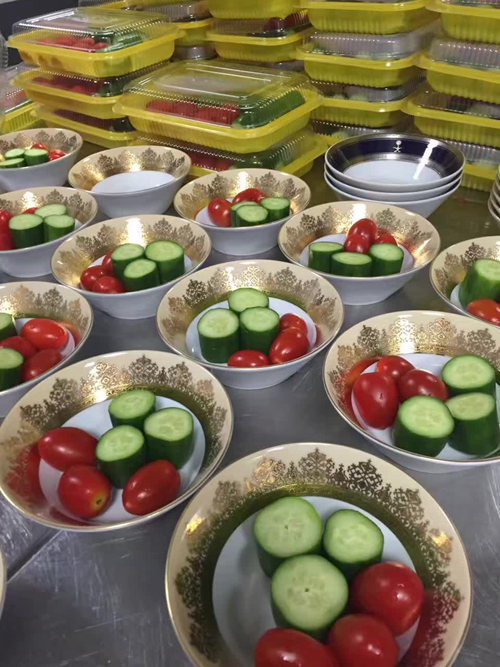 菜單確定后,酒店餐飲部各司其職,進(jìn)入緊張的工作狀態(tài)。9月3日定制食材,9月4日進(jìn)行食品加工制作。在時間緊迫的情況下,卻又突生小狀況,酒店于9月4日下午1時臨時接到沙方消息,原定于5日下午5時左右從杭州蕭山機(jī)場起飛的航班,臨時調(diào)整至5日上午10時30分,這對酒店來說意味著又減少了近7小時的制作時間。為了能順利完成此次任務(wù),酒店召集了廚房部門所有同事,60余人進(jìn)行通力協(xié)作,8小時的不眠不休,終于在5日凌晨1時將1104份航空餐全部打包裝箱進(jìn)入運(yùn)輸車,在機(jī)場指定時間內(nèi)保質(zhì)保量將航空餐送達(dá)機(jī)場。