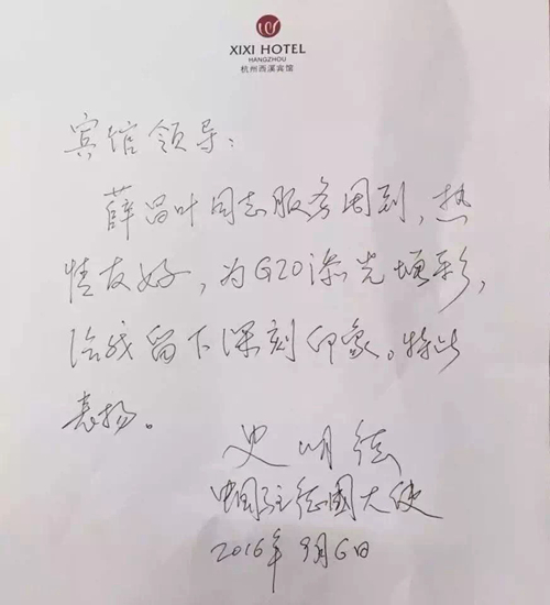 西溪賓館總經理還說到,在送別23位大使及各部委領導之時,每一位賓客都贊美了酒店優美的自然景色,感謝每一位員工對他們的細心照顧,讓他們住得十分舒心。多位大使表示,希望有機會還能來到杭州西溪賓館休息或度假。酒店收到了多封表揚信及感謝信,客房部的薛昌葉還收到了駐德國大使的表揚,表達對其工作的肯定,贊她為G20添光增彩!