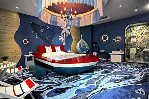 酒店主題確定后,緊接著的就是建筑形態上的遞進,如規模較大經營較成功的到啦主題酒店就有城堡型、農場型,還有叢林型等系列房型。內部裝飾的確定,在細節上也可見真功,如在床單、窗簾、燈具、茶具、座椅、電話,乃至衛生間等等細節都注意主題元素的融入。