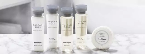 世界各地的華爾道夫酒店及度假村中使用的備品為低調奢華的意大利皮革品牌菲拉格慕。菲拉格慕作為意大利百年奢侈品牌,跨界也非常成功。這套專供華爾道夫的備品用的是Tuscan Soul系列,和同系列香水的味道相當,但相對清淡一些。香調有佛手柑,谷檸檬,柑桔,木蘭花混合鳶尾花和無花果樹,襯托出華爾道夫華而不俗的品牌格調。