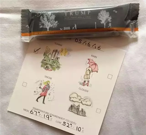 這樣溫馨的夜床天氣預報卡片和巧克力,很溫馨,很不那種Trump呢。