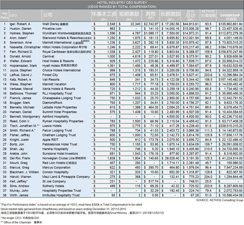 據(jù)AETHOS咨詢集團(tuán)的一份最新報告, 該公司發(fā)布了其第20次對酒店首席執(zhí)行官們的薪酬審查,發(fā)現(xiàn)2015年CEO的平均收入超過600萬美元,同時該行業(yè)的平均股權(quán)擁有量在同一時期超過4000萬美元。 該公司還采用績效薪酬模型評估了38位CEO的績效,考慮市值,股票升值,EBITDA增長和直接薪酬總額,以確定這些領(lǐng)導(dǎo)人是否贏得了他們的報酬。