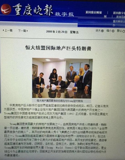 在特朗普勝出總統大選之后,8年前的一則新聞簡訊在特朗普勝選美國總統之后,再度刷爆朋友圈。這則簡訊的主要內容是:2008年2月,中國房地產十強企業恒大地產集團與美國最大的地產開發商之一特朗普集團及中國香港房地產投資公司東方地產集團(OPG)正式結盟,在中國主要超大型城市的頂級豪宅及超高建筑領域展開合作。