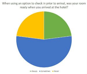 23%使用移動端辦理入住的旅客表示,他們“從來沒有”發現到達后客房可立即入住。54%的客人表示客房“有時”是已經準備好可隨時入住的。