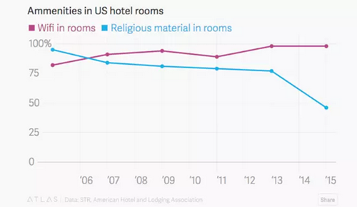 作為酒店“設(shè)施”,Wi-Fi 和圣經(jīng)的占比變化(截圖來自 Quartz)