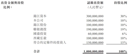 據此協議,各方合計出資10億元人民幣,其中,錦江資本出資3億元持有WeHotel30%股權,錦江酒店與錦江股份分別出資1億元,均持有10%的股權。